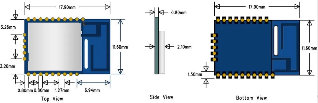 RC2340R5A 模块尺寸为17.9*11.6*2.1 mm,模块主体部分焊接了金属屏蔽盖,厚度大概为2.1±0.1 mm。