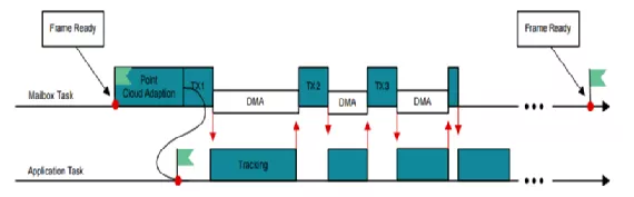 在任务处理方式上该设计有自己独有的处理方式。如上图所示,Mailbox为高优先级任务,Application为低优先级任务。在系统配置中,处于优先级的Mailbox任务会收到一个来自DSP准备就绪的信号,Mailbox任务会将相关数据复制于TCM中,并且与应用Application完成通信,给Application发布任务,创建传输帧头,并且为框架内的每一部分启动一个DMA进程。每当DMA与UART进行数据传输时,Mailbox任务就会产生一个低优先级的任务。当DMA进程结束时可以新增DMA,实现任务处理和DMA之间的并行性。